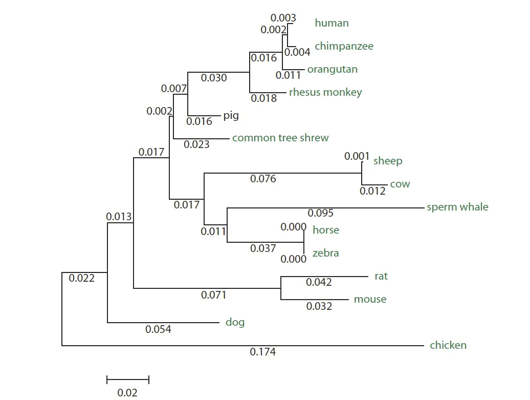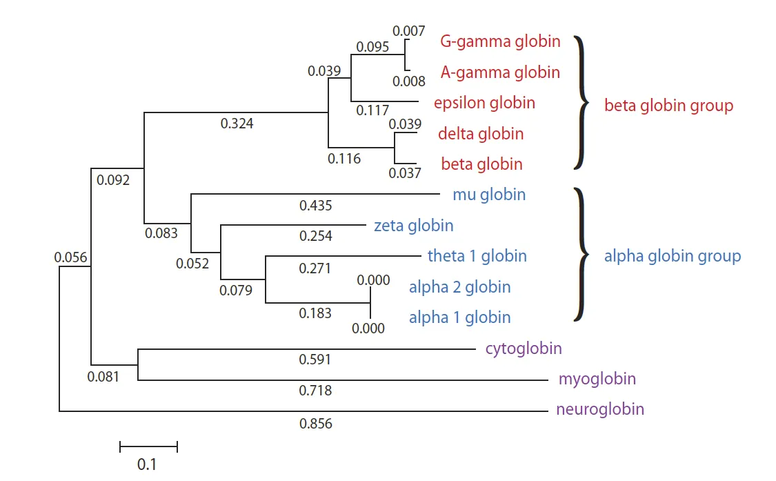 A continuación tienes un dibujo con el árbol de los ortólogos de la mioglobina: