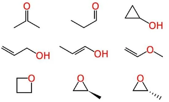 Més enllà de molècules tan minúscules i senzilles, aviat sorgeixen dificultats. Algunes d’aquestes ambigüitats afecten els químics humans de la mateixa manera que afecten les màquines. Considereu la fórmula molecular de C 3 H 6 O, que està associada a múltiples estructures raonables, incloent una cetona, un aldehid, un alcohol cíclic, alquens oxigenats i èters cíclics, un dels quals existeix com a dos enantiòmers: