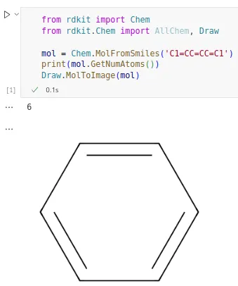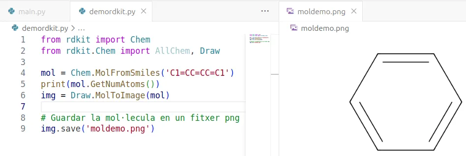 A continuació tens un exemple de codi que usa la biblioteca RDKit per a representar en 2D el Benzè.