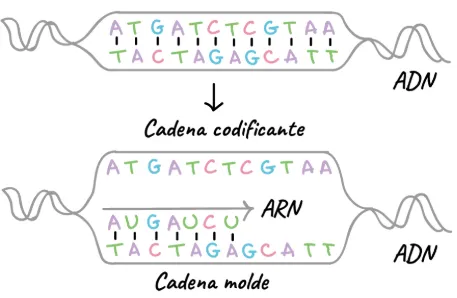 5'-ATGATCTCGTAA-3' 3'-TACTAGAGCATT-5'La transcripció d’una de les cadenes d’ADN produeix un ARNm amb una seqüència gairebé idèntica a l’altra cadena d’ADN. A causa de les diferències bioquímiques entre l’ADN i l’ARN, les T de l'ADN es reemplacen amb U a l'ARNm.