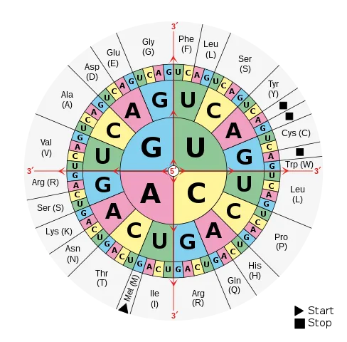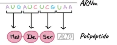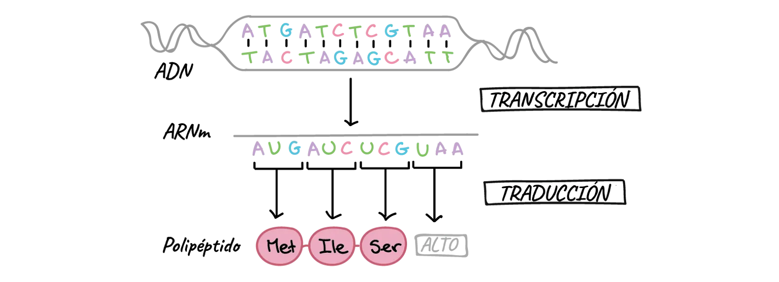 5'-AUGAUCUCGUAA-5'Un cop completada la transcripció, la traducció implica llegir els nucleòtids de l'ARNm en grups de tres, cadascun dels quals especifica un aminoàcid (o proporciona un senyal de terminació que indica que ha finalitzat la traducció).