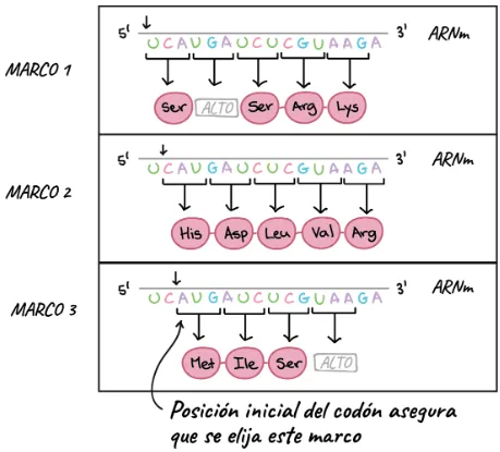 Específicament, els nucleòtids de l’ARNm es llegeixen en triplets (grups de tres) anomenats codons: