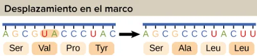 La il·lustració mostra una mutació de marc de referència on el marc de lectura s’altera per la eliminació de dos aminoàcids.