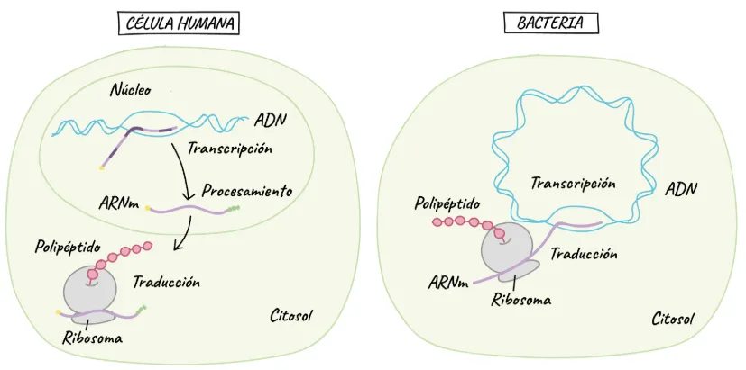 En eucariotes, la transcripció té lloc al nucli, mentre que la síntesi de proteïnes (traducció) ocorre al citosol. Per això, l’ARNm ha de sortir del nucli abans de ser traduït en un polipèptid. En canvi, els bacteris, que no tenen nucli, duen a terme la transcripció i la traducció simultàniament al citosol.