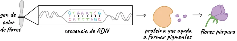 Per exemple, a l’experiment de Mendel, el gen del color de les flors té les instruccions per fer una proteïna que ajuda a produir molècules acolorides (pigments) als pètals de les flors.