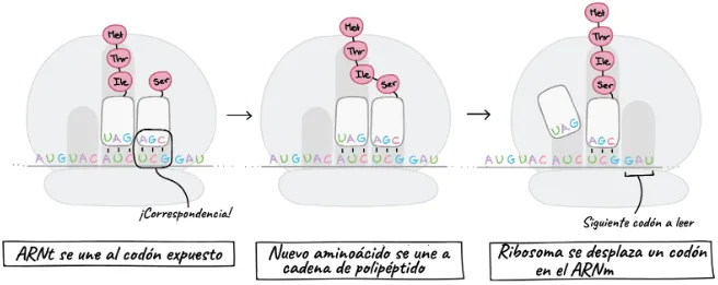 La traducció ocorre dins d’estructures conegudes com a ribosomes. Els ribosomes són màquines moleculars la funció de les quals és construir polipèptids. Quan un ribosoma es munta sobre un ARNm i troba el codó d’inici, es desplaçarà ràpidament per l’ARNm un codó alhora.