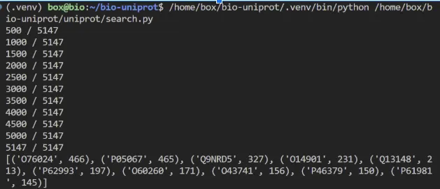 # See the accessions with the greatest number of interactionssorted_interactions = sorted(interactions.items(), key=lambda item: item[1], reverse=True)print(sorted_interactions[:10])A continuació tens el resultat d’executar el programa: