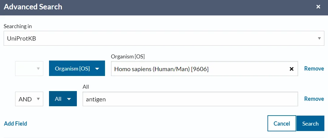 | query | string | See query syntax and query fields for UniProtKB. |