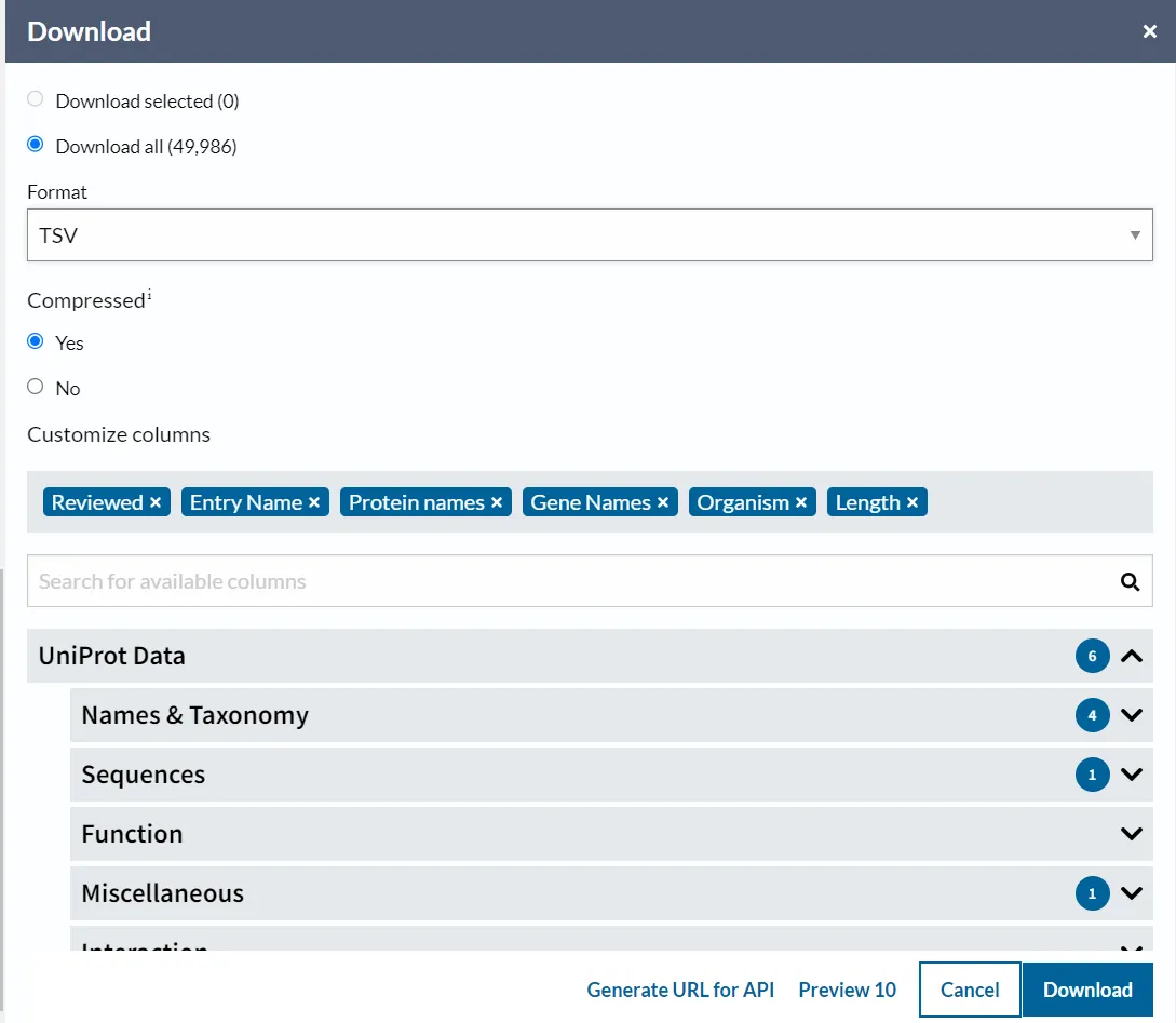 També pots cercar els noms de columnes rellevants a la llista completa de UniProtKB column names for programmatic access.
