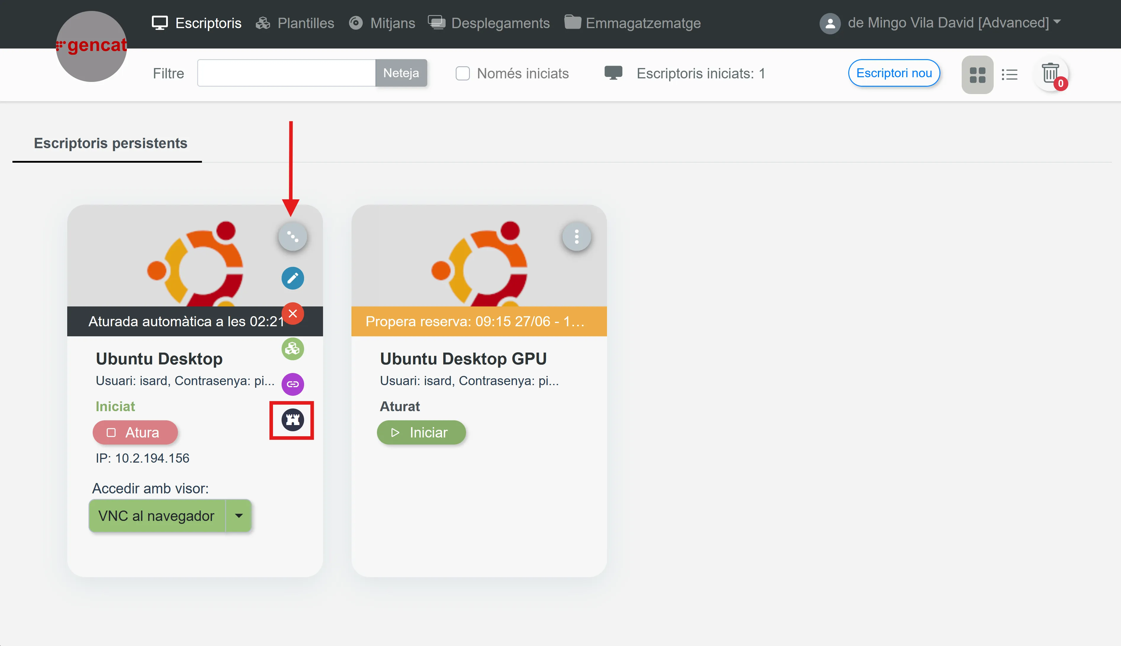 En l’apartat principal d’escriptoris, pots accedir al botó de bastion per veure el UUID juntament amb els URL per als protocols activats: