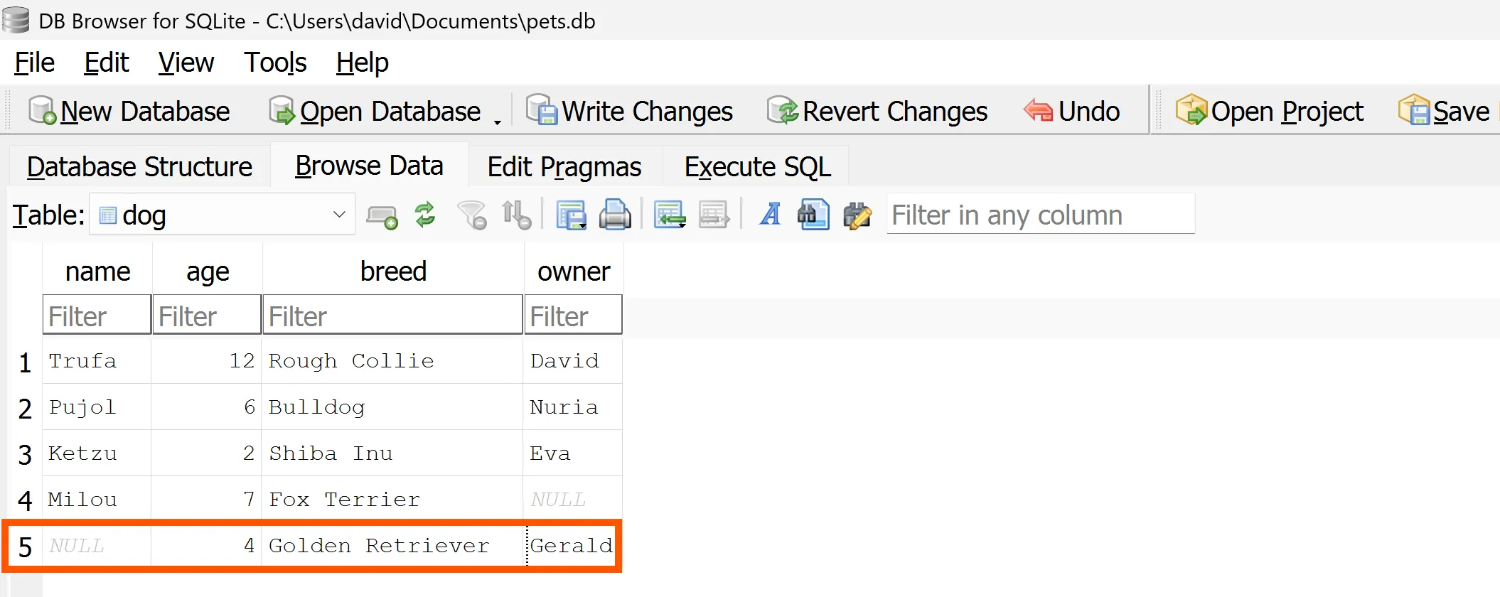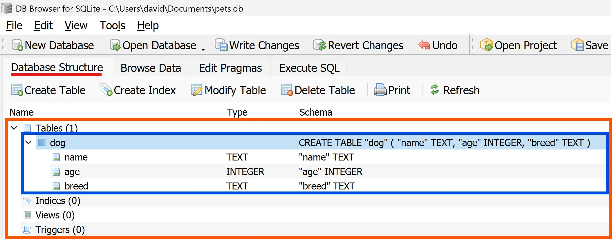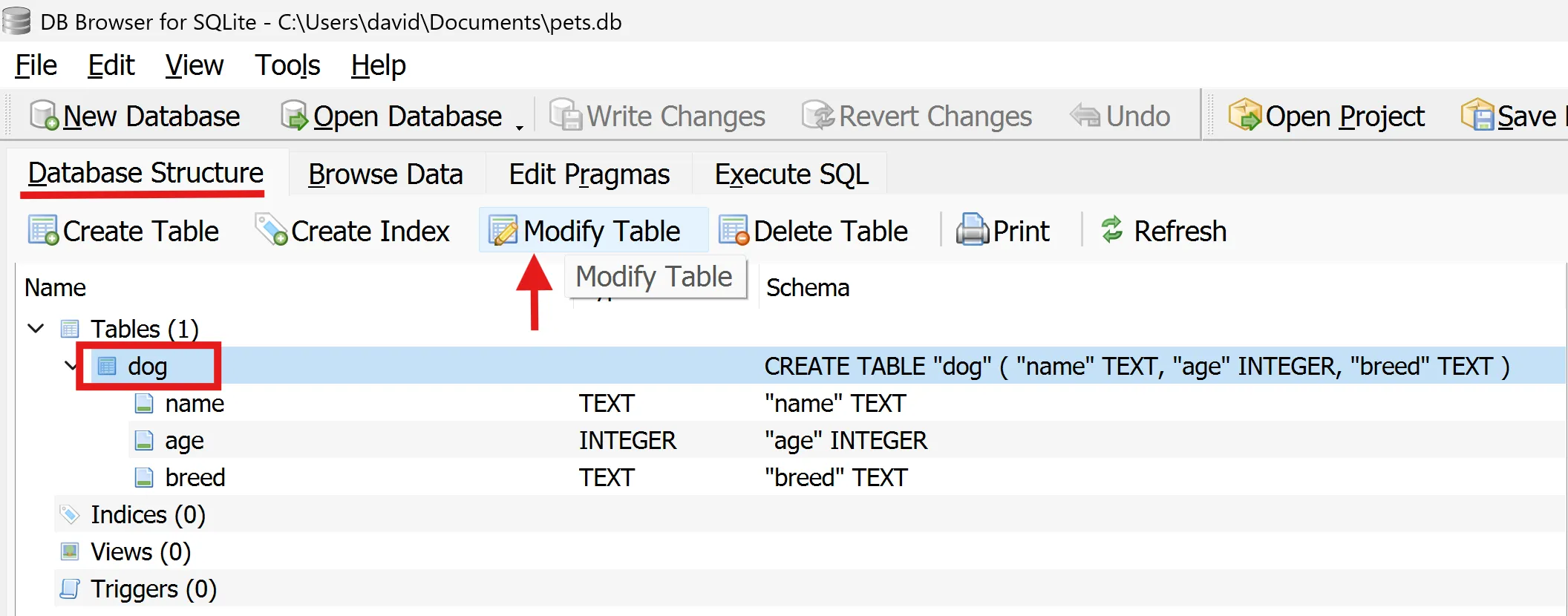 Pots veure que la taula dog ja forma part de la base de dades pets.db: