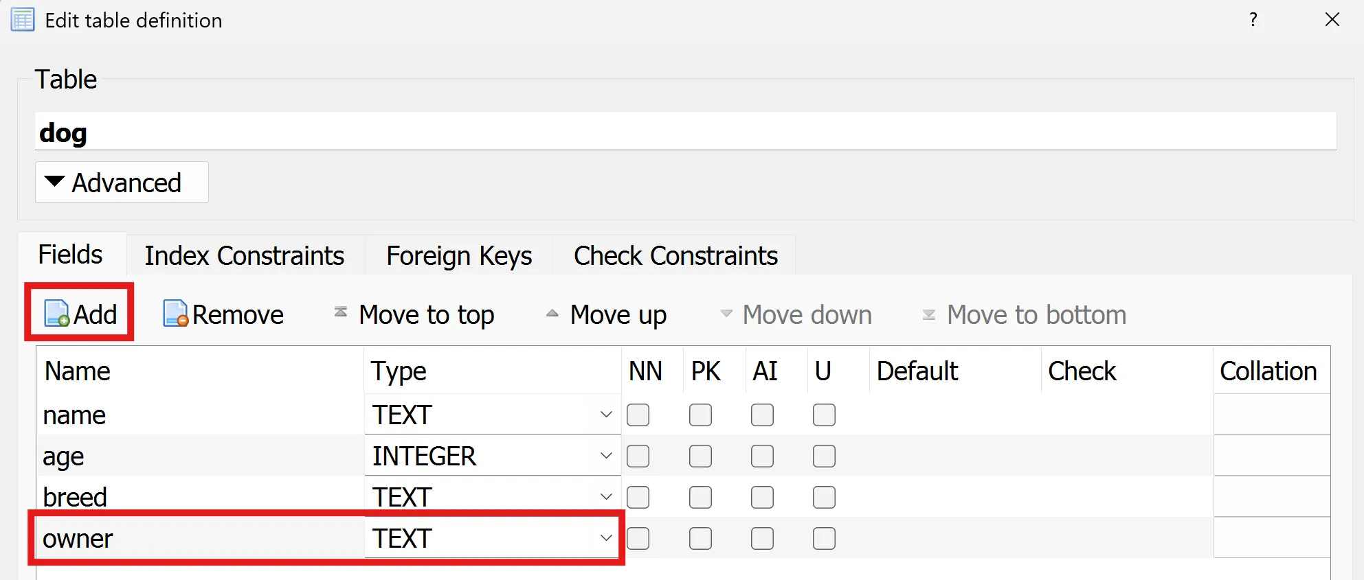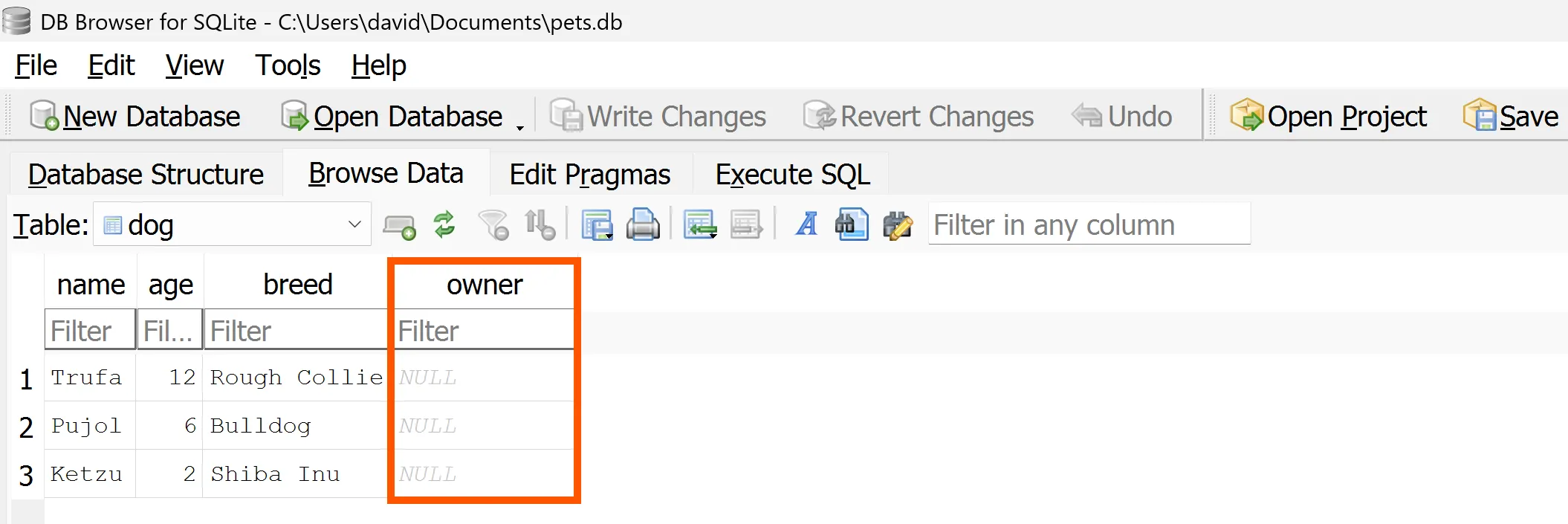 A continuació afegeix una columna owner a la taula dog: