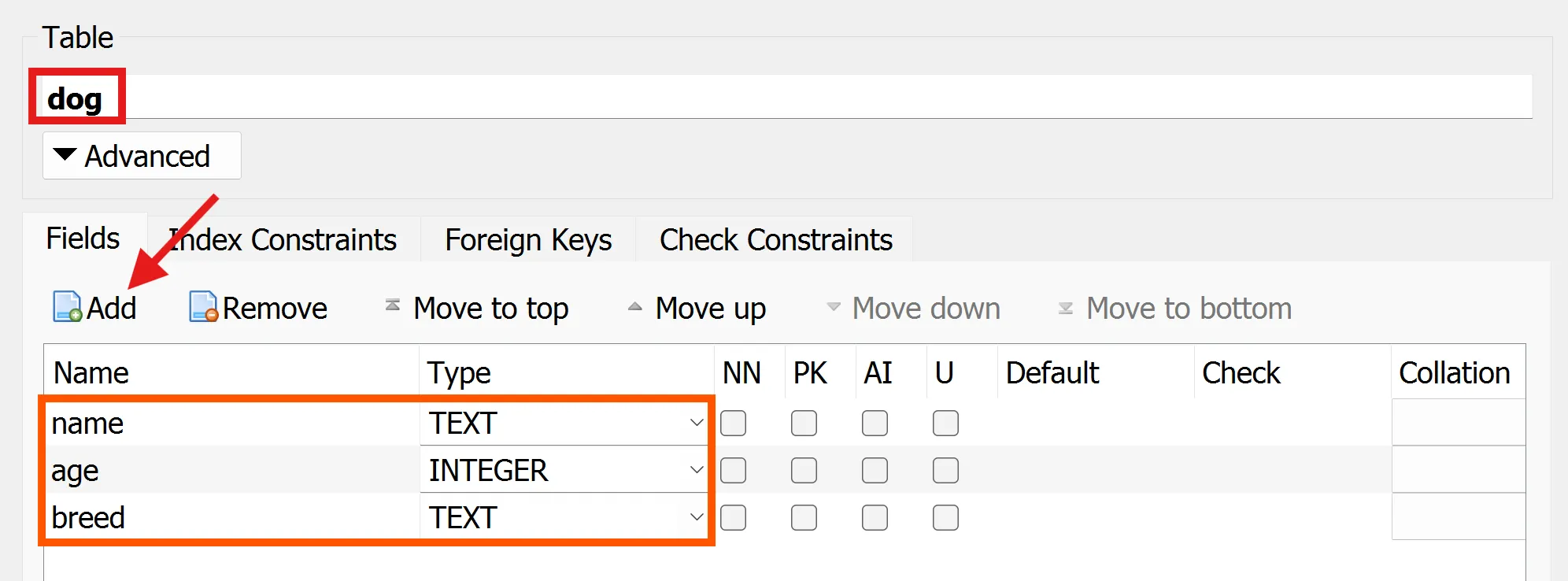 A continuació crea la taula dog amb les columnes name, age i breed.