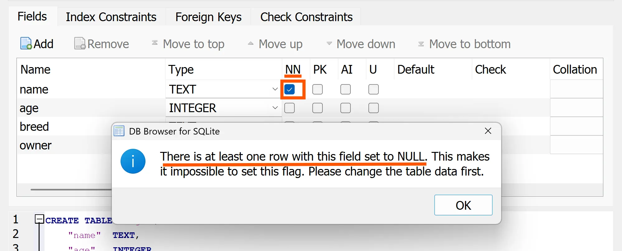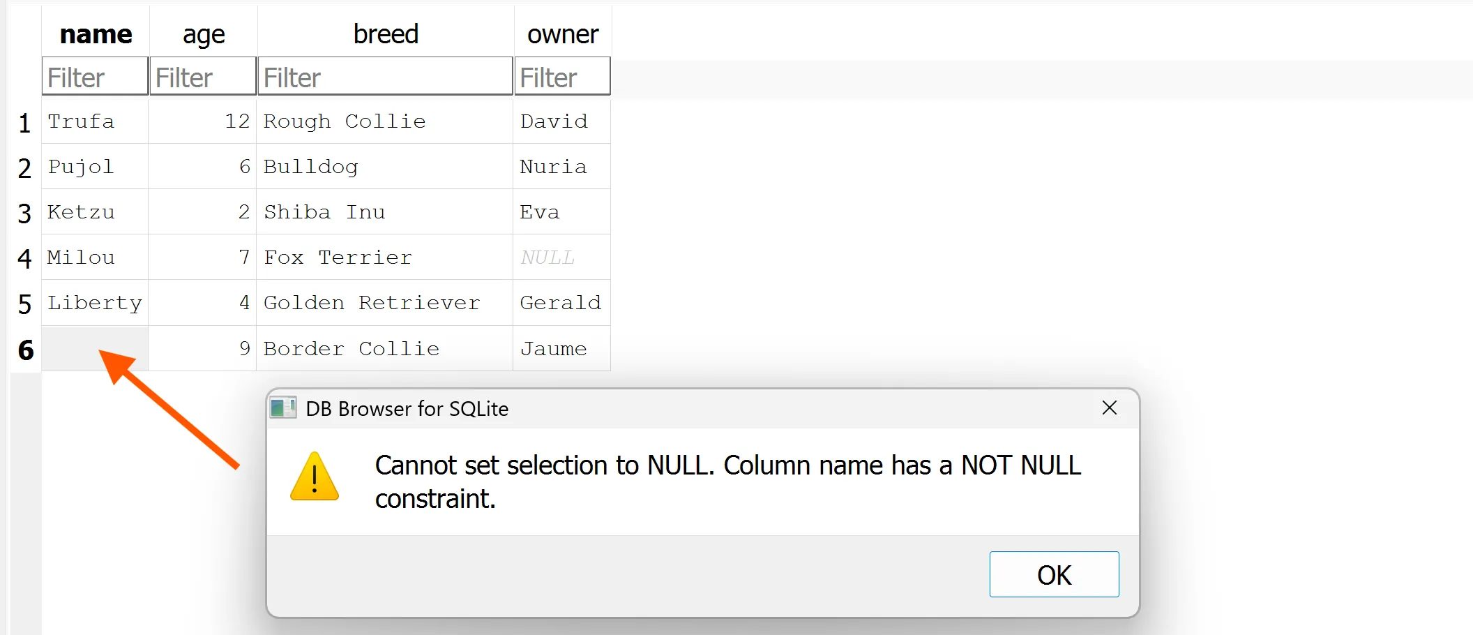Com que ara la fila 5 té un valor nul per la columna name, no pots modificar la condició de la columna name a not null.