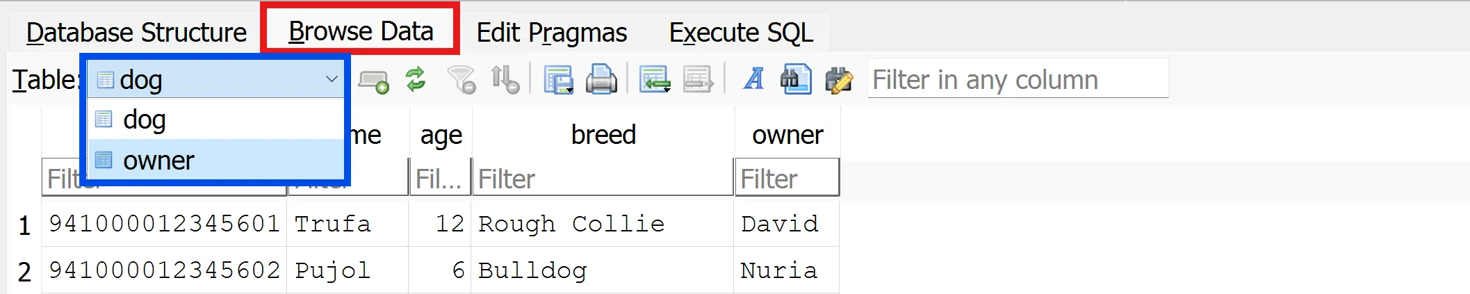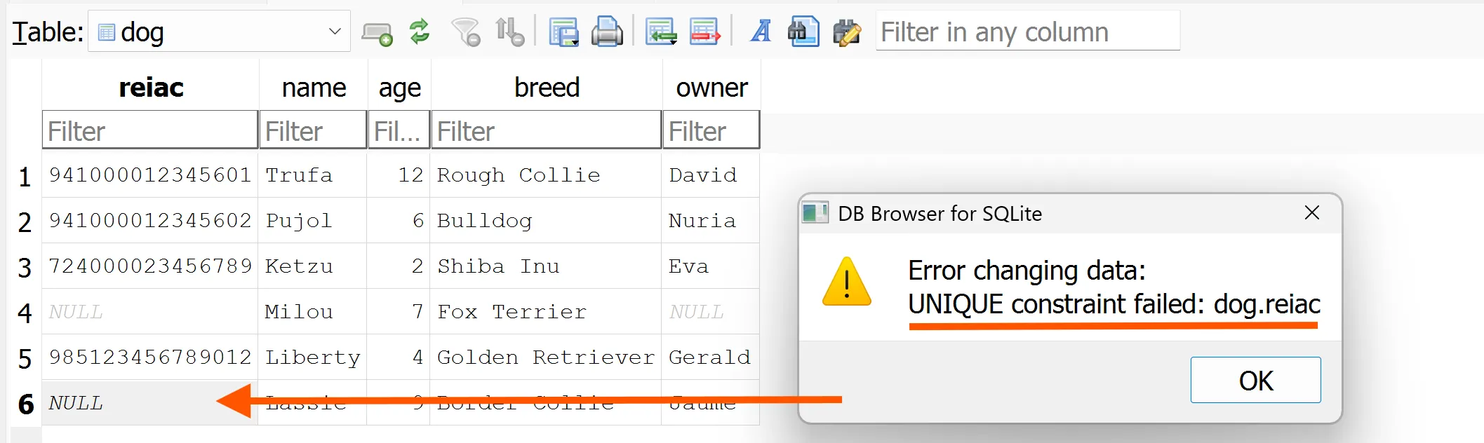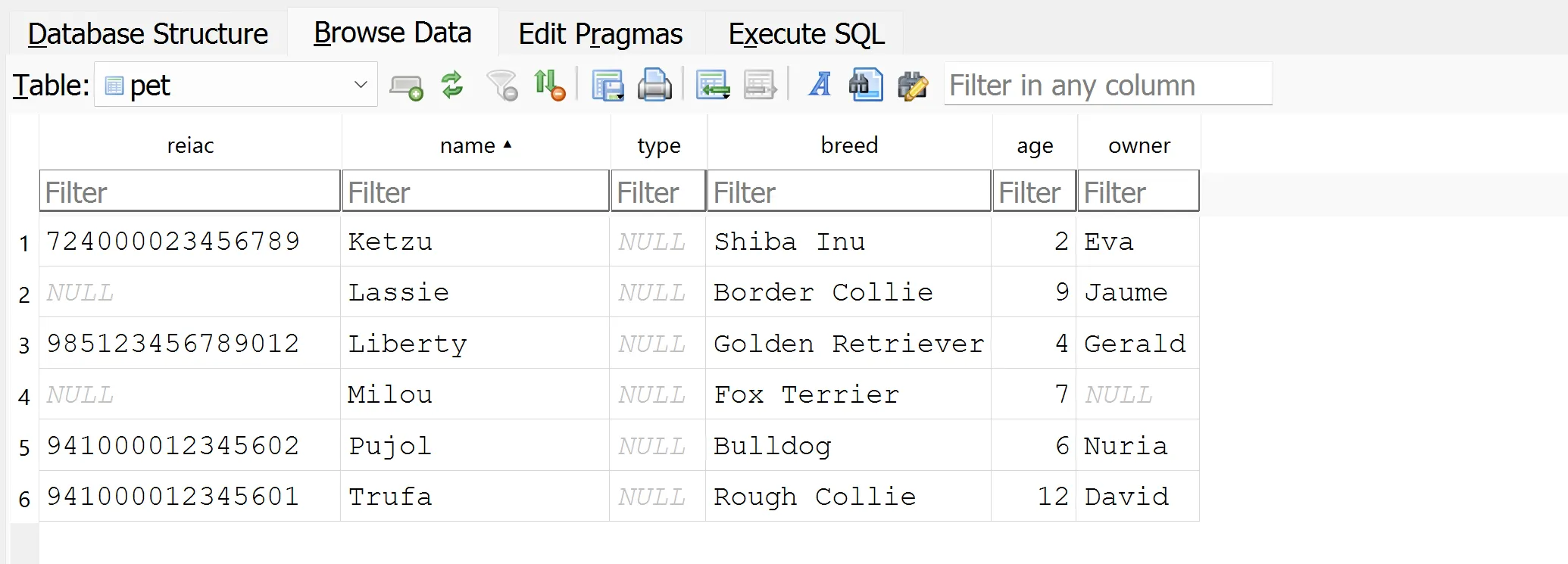 Com que la base de dades no pots saber quins són els noms dels propietaris dels gossos que estan a la taula dog, els valors de la columna owner seran null.
