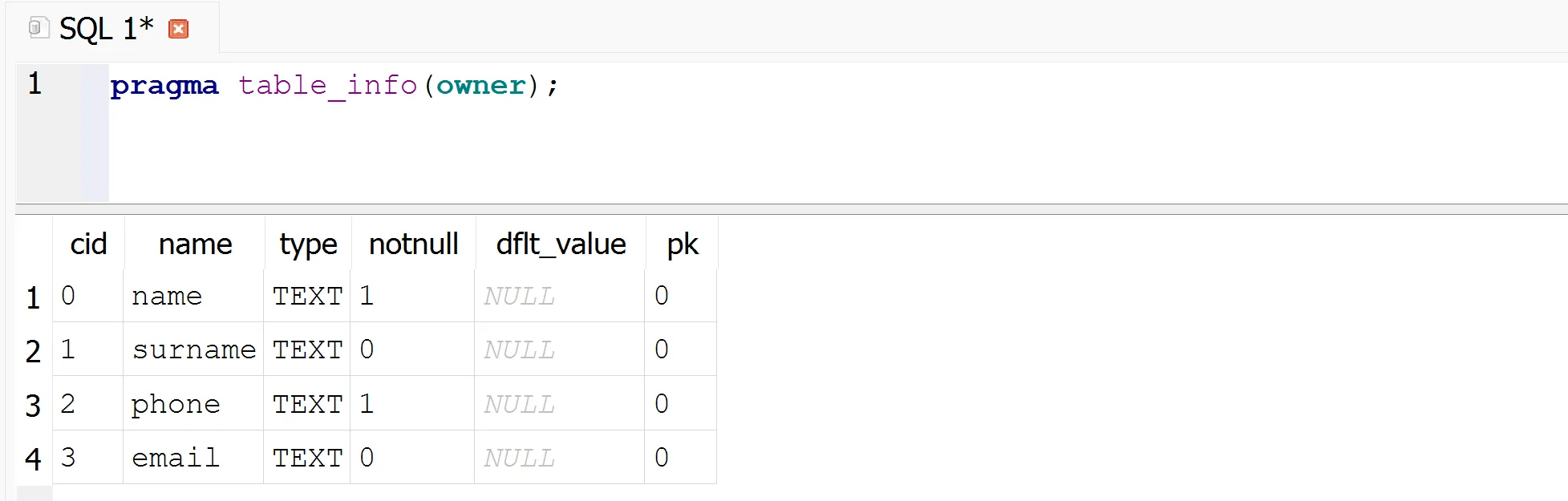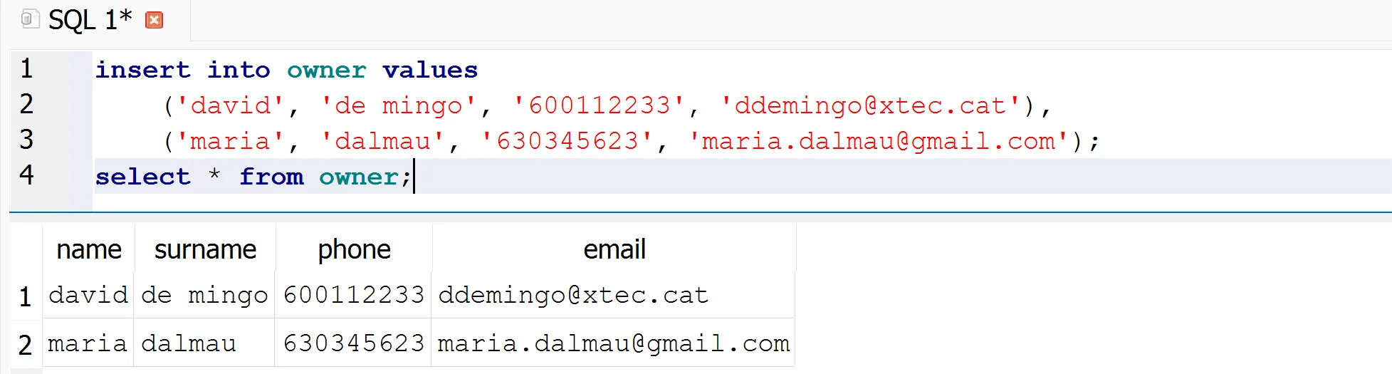 ('david', 'de mingo', '600112233', 'ddemingo@xtec.cat')('maria', 'dalmau', '630345623', 'maria.dalmau@gmail.com')Primer demana a SQLite que et mostri la descripció de la taula owner: