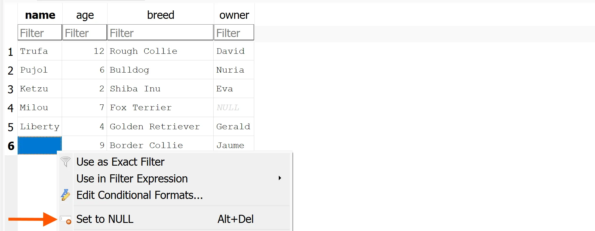 | name | age | breed | owner |