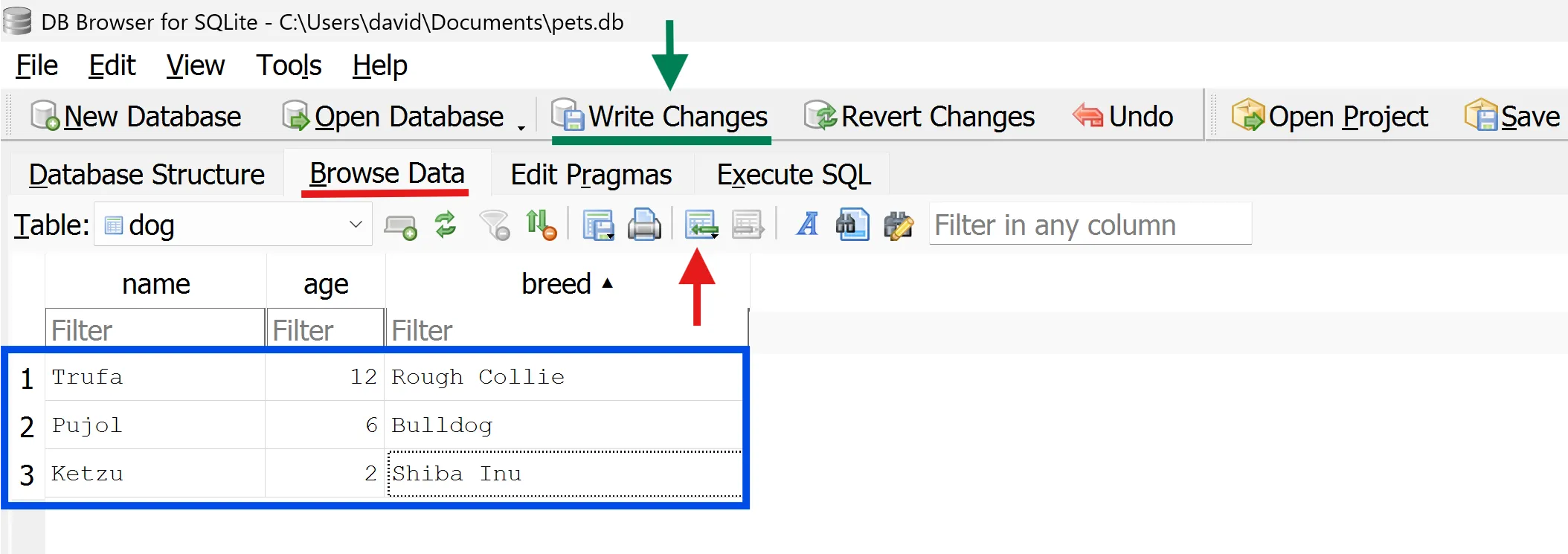 En finalitzar, escriu els canvis al fitxer pets.db (Write Changes)
