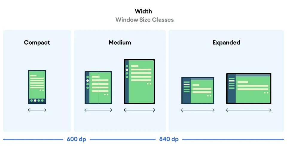 Para ayudarte a encontrar el umbral correcto en el que se debe cambiar la IU de tu app, existen tres puntos de interrupción que ayudan a clasificar los dispositivos en clases de tamaño predefinidas: compact, medium y expanded.