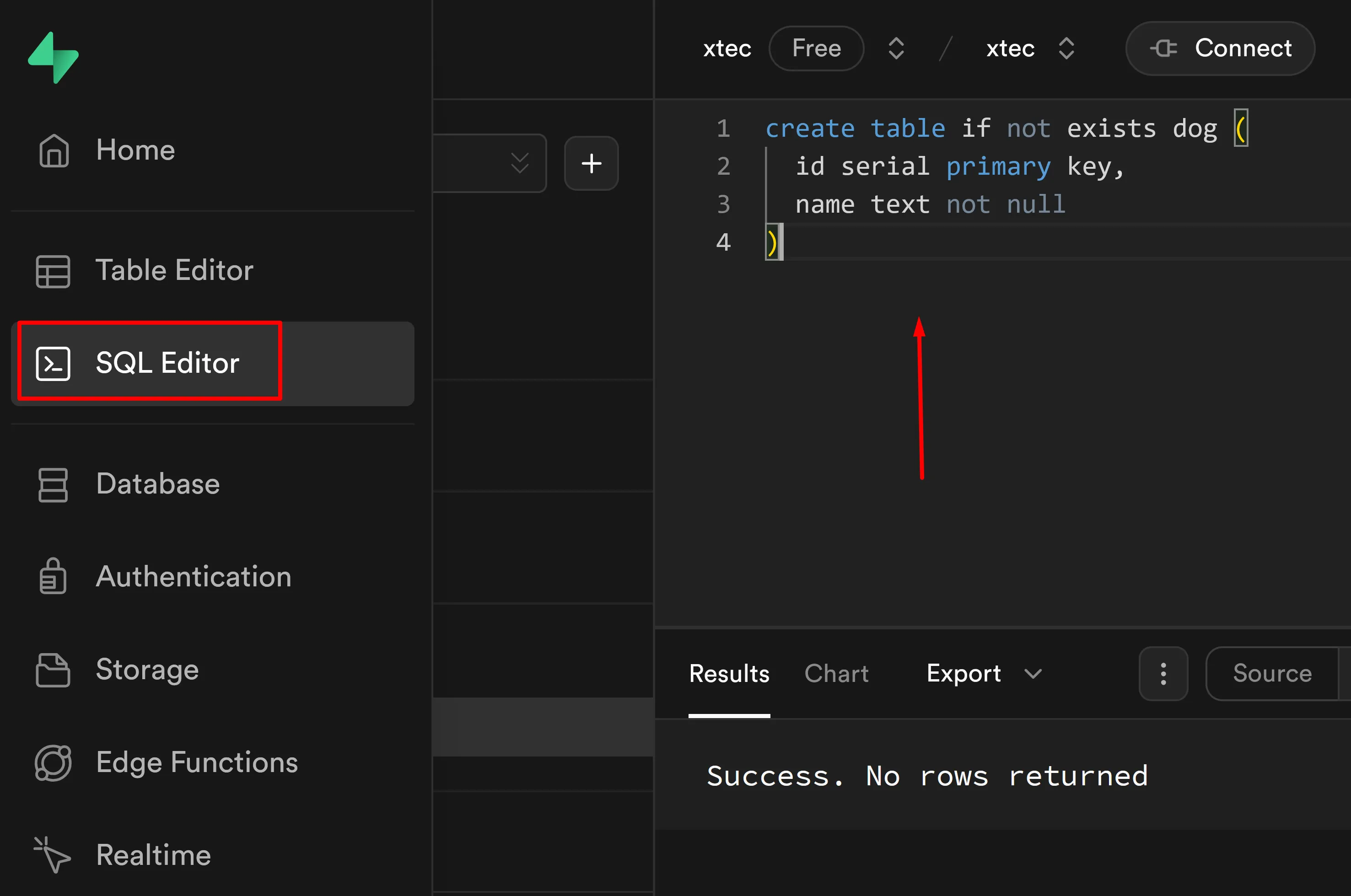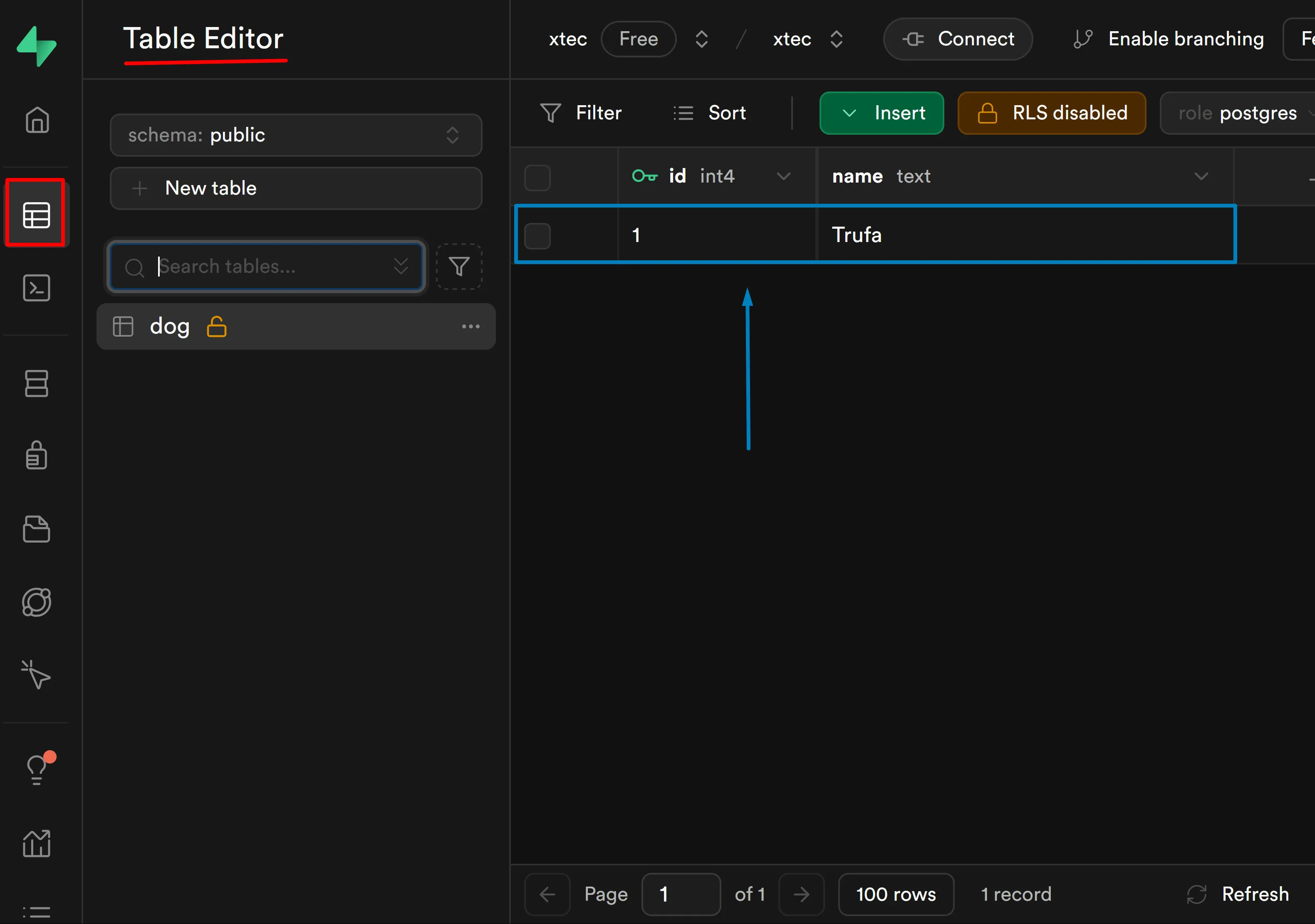 Executa el codi i verifica al “Table Editor” que s’ha inserit el nou registre: