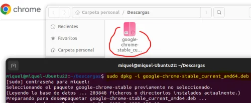 Per instal·lar el Chrome, el millor és entrar al terminal, a la carpeta de Descargas, i executar la comanda dpkg (per instal·lar paquets de Debian, distribució pare d’Ubuntu)
