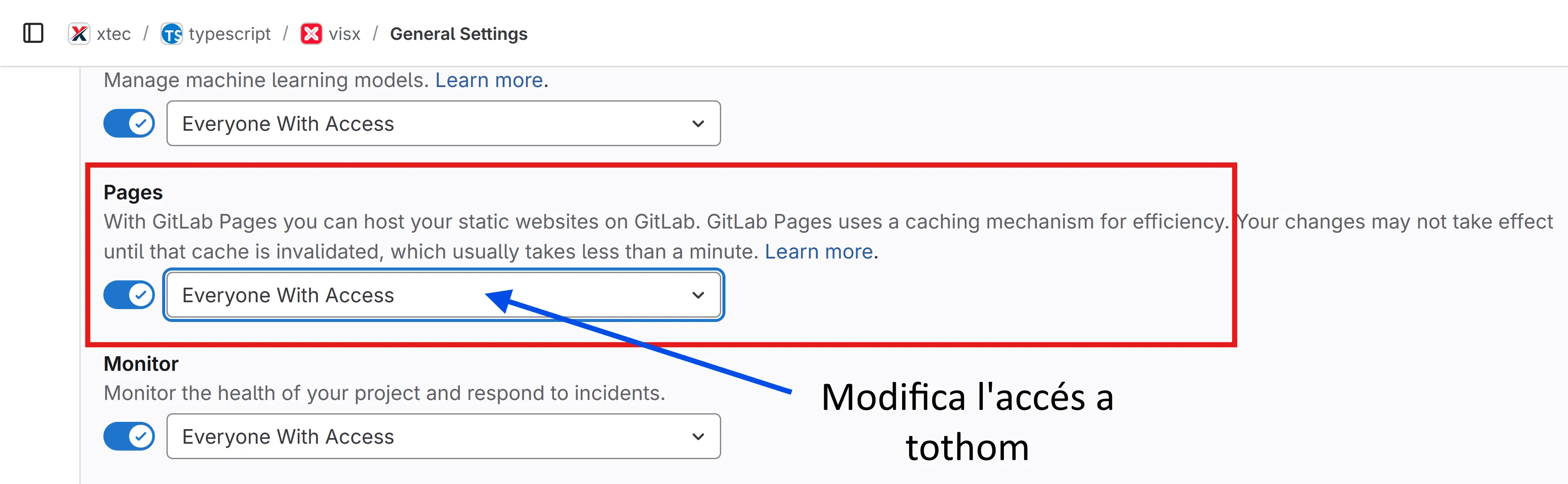 General Settings>Visibility, project features, permissions - Modifica