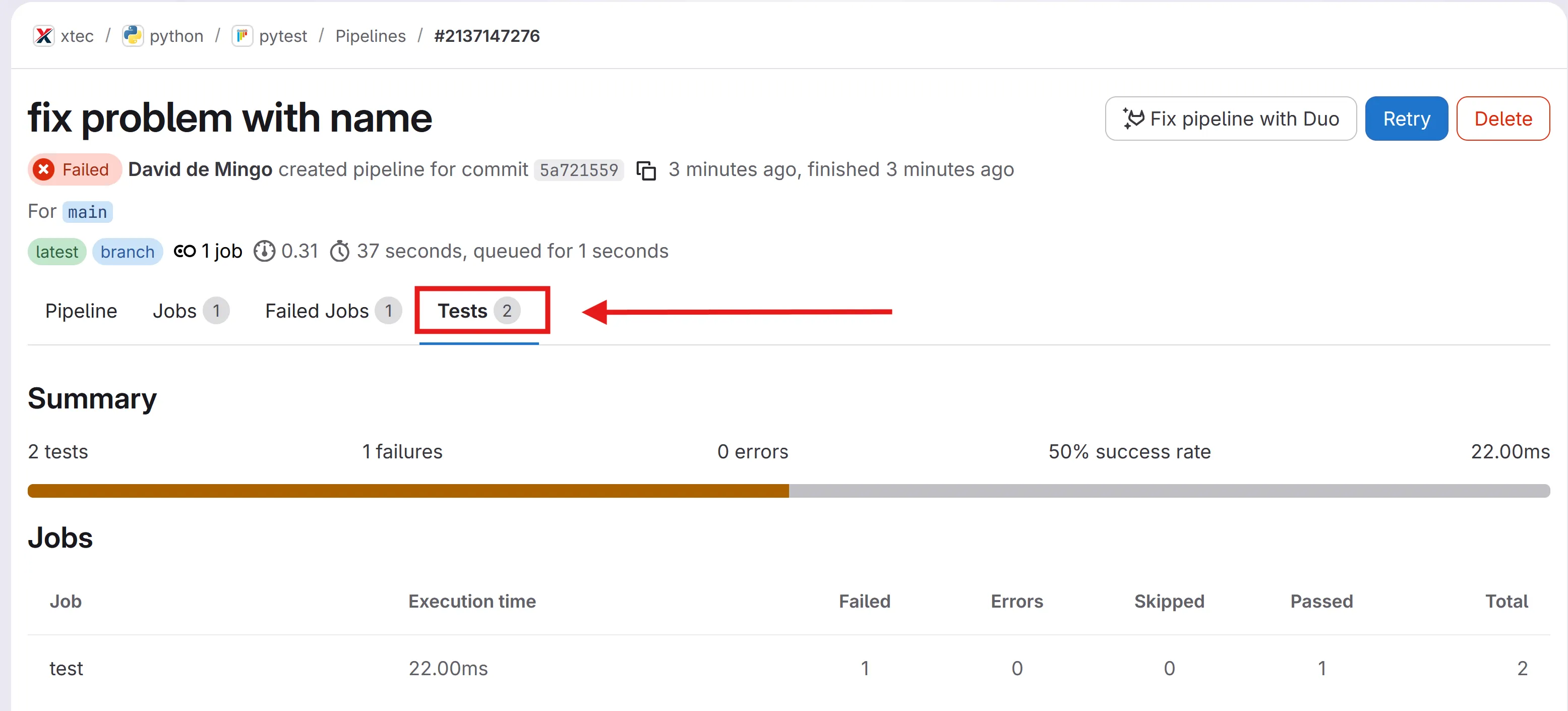 test: stage: test image: ghcr.io/astral-sh/uv:debian script: - uv sync - uv run pytest --junitxml=report.xml artifacts: when: always reports: junit: report.xmlYou can view test results:
