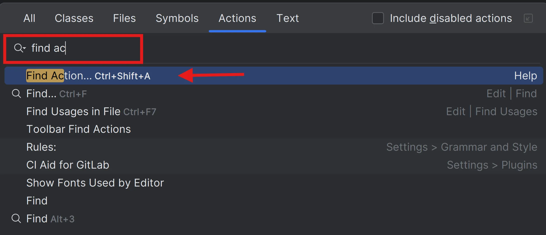 Prem Ctrl + Shift + A, i comença a escriure per obtenir una llista d’accions suggerides. Després selecciona l’acció necessària i prem Enter per executar-la.