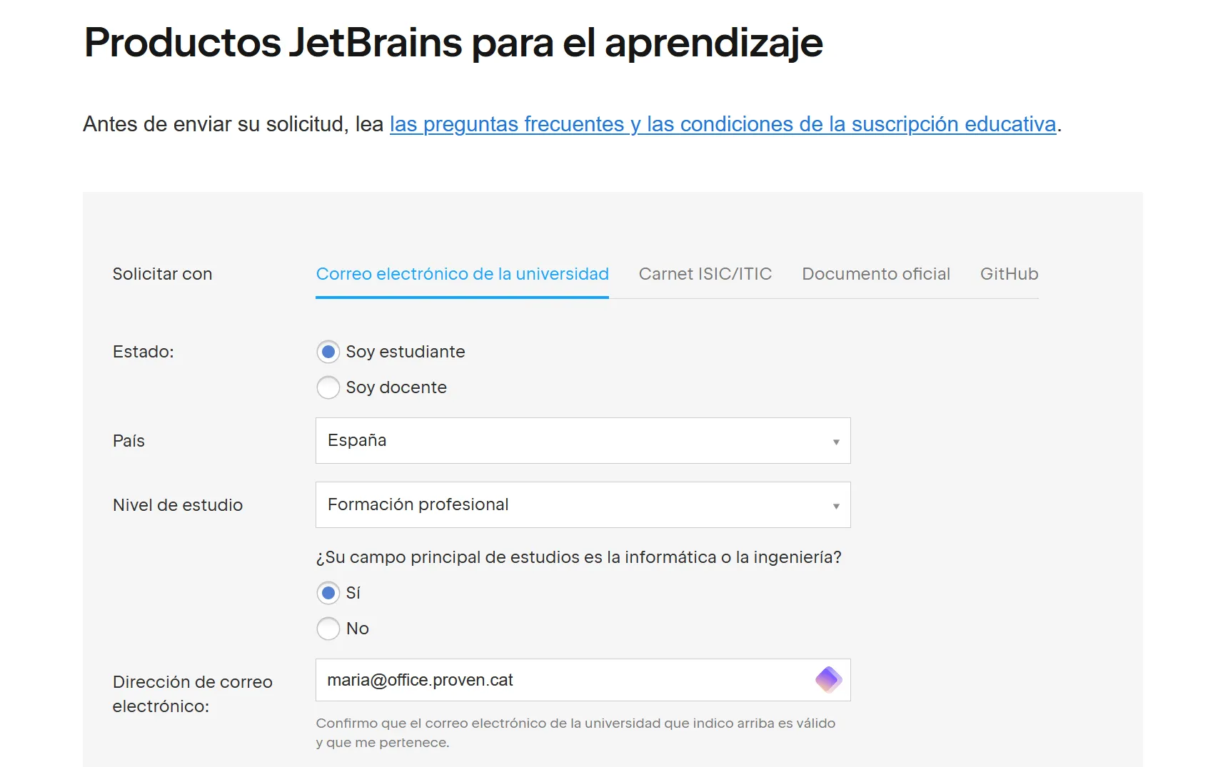 Com a estudiant o professor, pots utilitzar totes les IDEs de JetBrains per ús personal tant a l’escola com a casa, tal com s’explica a Free Educational Licenses