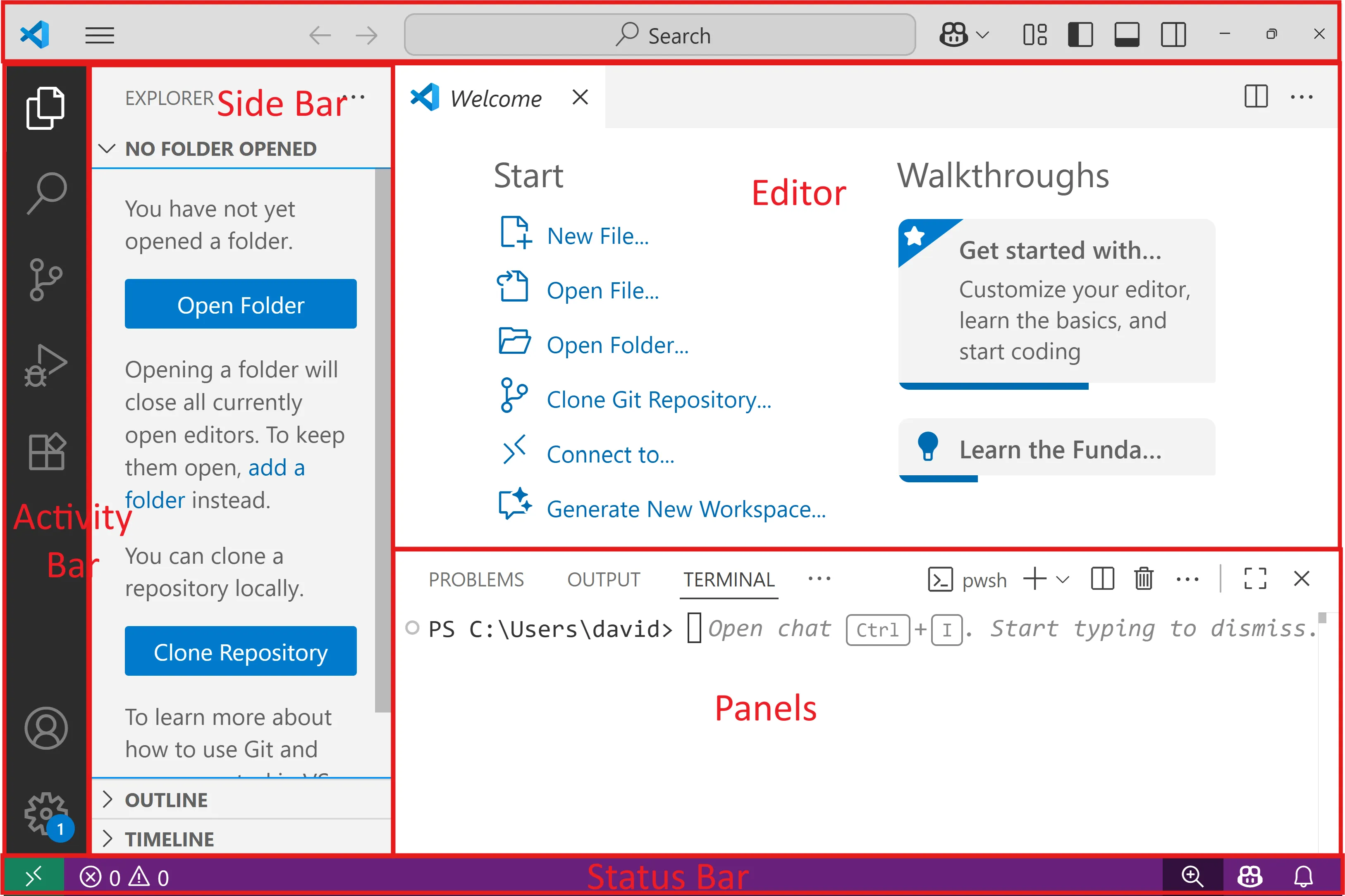 La interfície d’usuari (UI) de Visual Studio Code ofereix un disseny mínim i senzill que manté el codi font com a focus de l’entorn de desenvolupament. Quan inicies Visual Studio Code per primera vegada, mostra un disseny per defecte. A partir d’aleshores, cada vegada que l’obris, l’editor es recuperarà en el mateix estat en què es trobava en tancar-lo.