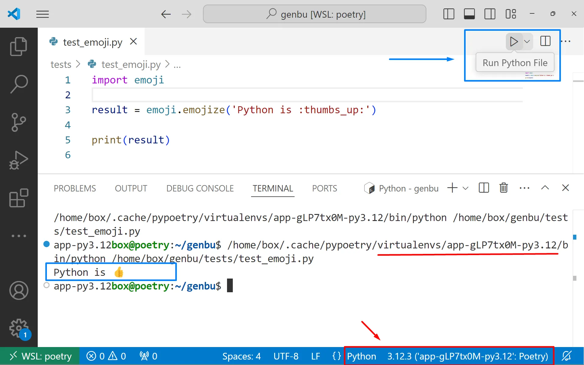 /$ poetry shellSpawning shell within /home/box/.cache/pypoetry/virtualenvs/app-gLP7tx0M-py3.12:~/genbu$ . /home/box/.cache/pypoetry/virtualenvs/app-gLP7tx0M-py3.12/bin/activate(app-py3.12) :~/genbu$Ara pots executar directament el fitxer test_emoji.py: