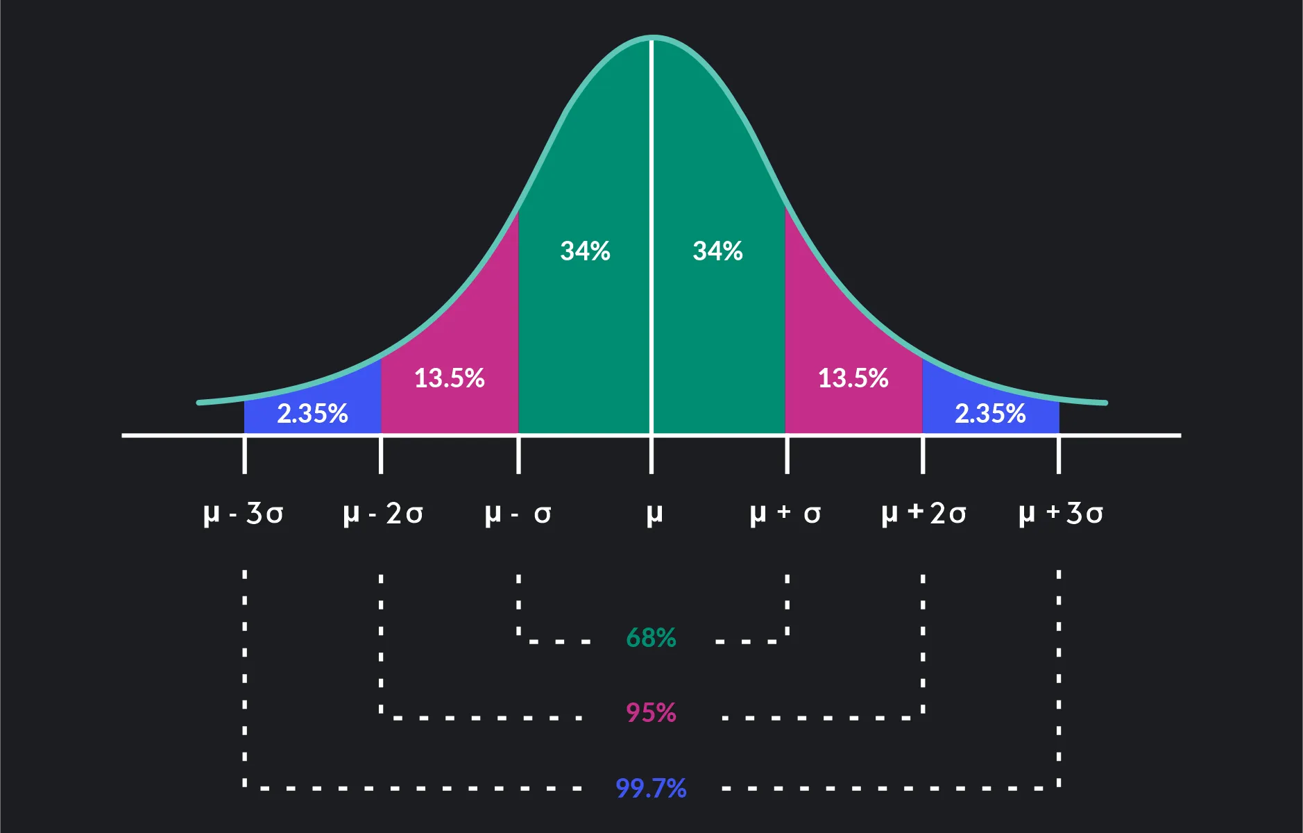# Càlcul del percentatge dins de +2 sigmamu = 0sigma = 1percent_within_2sigma = norm.cdf(mu + 2*sigma, mu, sigma) * 100print(f"Percentatge des de l'inici fins al +2σ: {percent_within_2sigma:.2f}%")