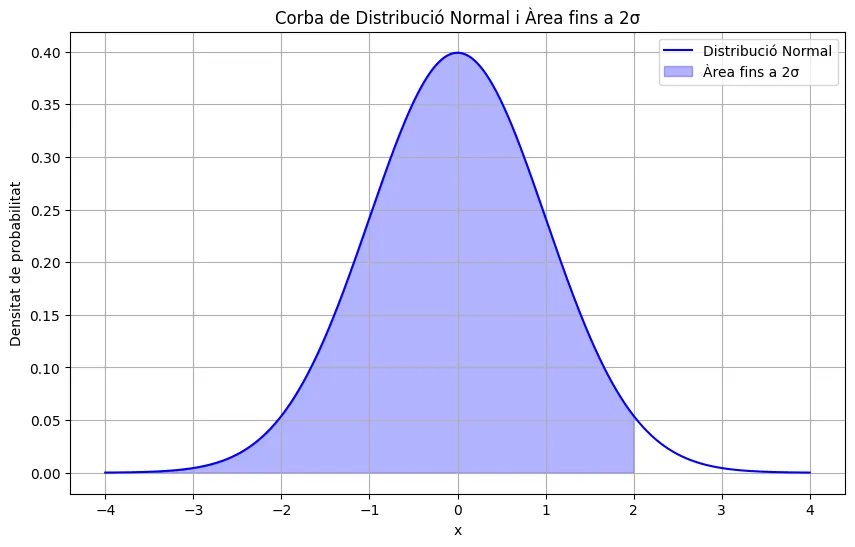 plt.title('Corba de Distribució Normal i Àrea fins a 2σ')plt.xlabel('x')plt.ylabel('Densitat de probabilitat')plt.legend()