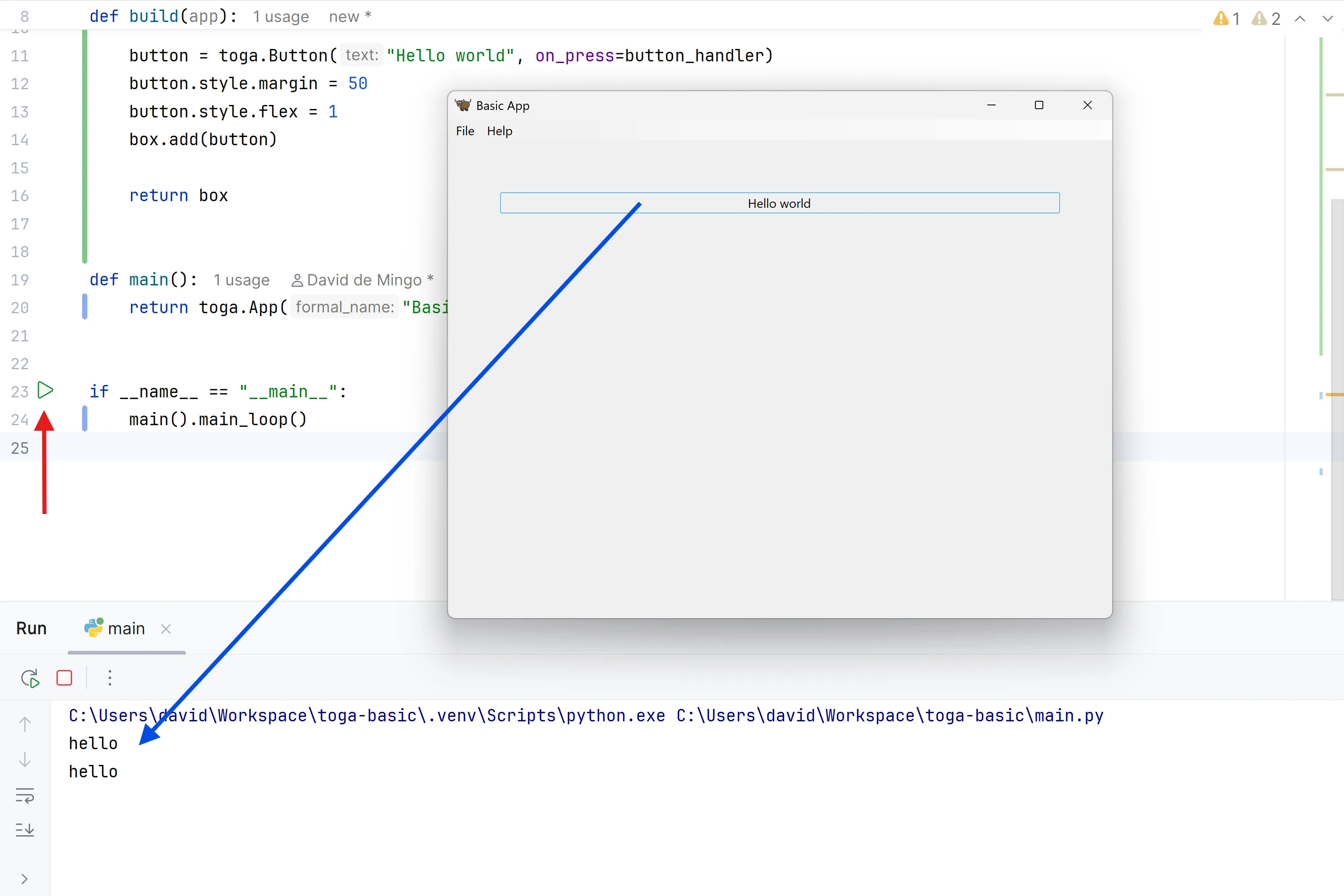 When the app gets instantiated (in main()), Toga will create a window with a menu. We need to provide a method that tells Toga what content to display in the window. The method can be named anything, it just needs to accept an app instance: