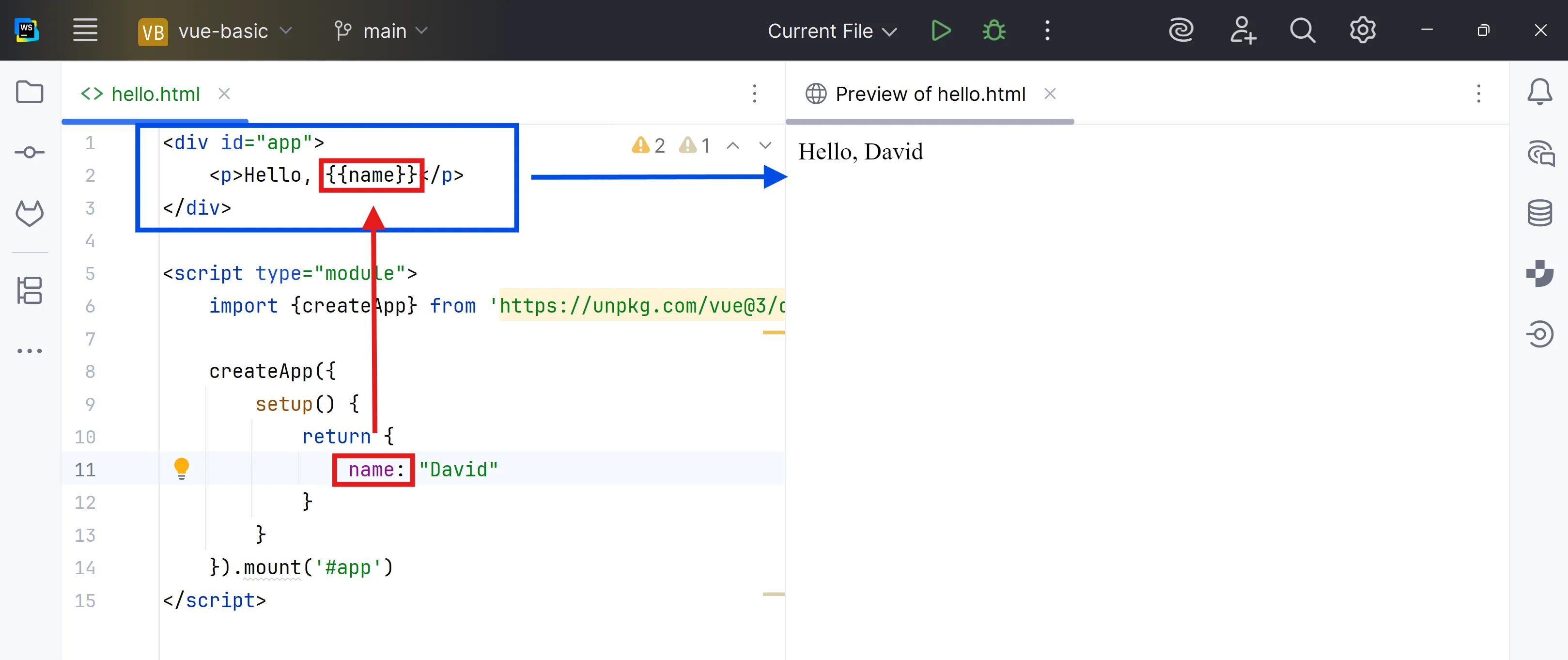<div id="app"> <p>Hello, {{name}}</p></div>