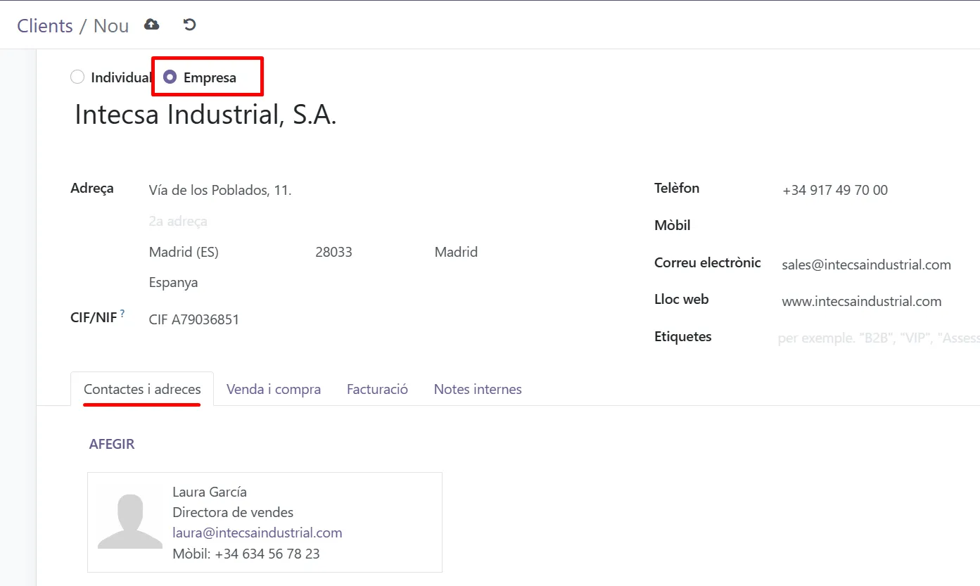 Important!. No has de crear una empresa nova perquè la versió gratuïta d’Odoo no permet crear departaments en altres empreses que no siguin la principal.