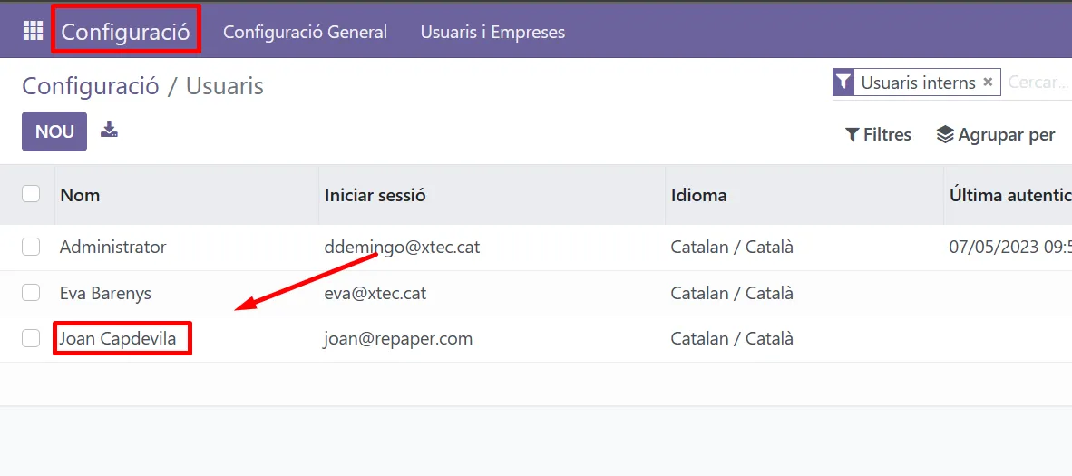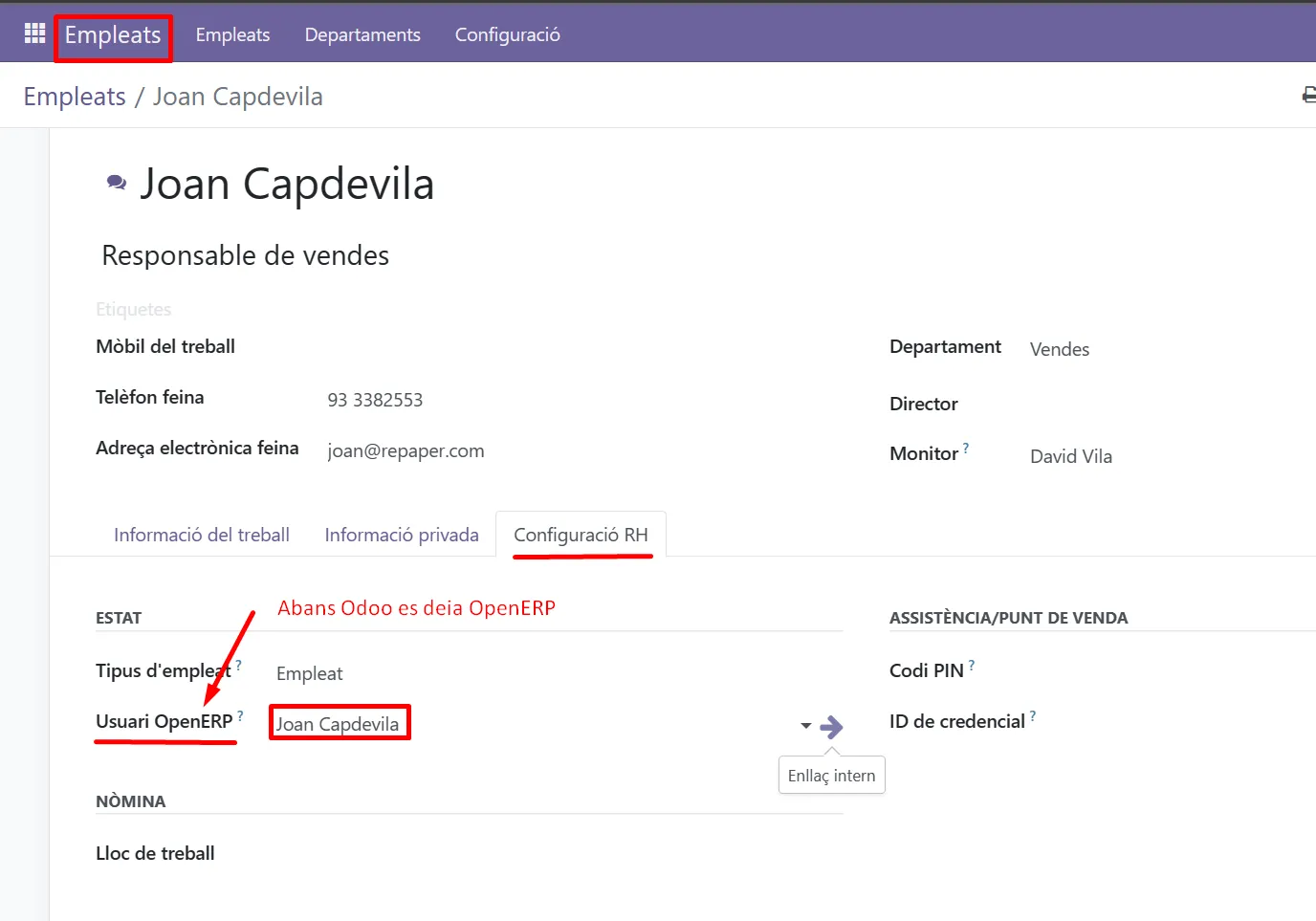 Perquè un empleat també sigui usuari d’Odoo l’has de donar d’alta com usuari: