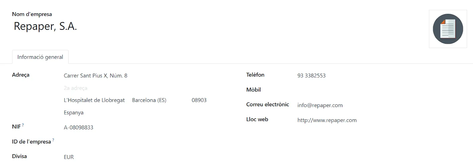 Ves a Configuració > Empreses i modifica la empresa “My Company”.