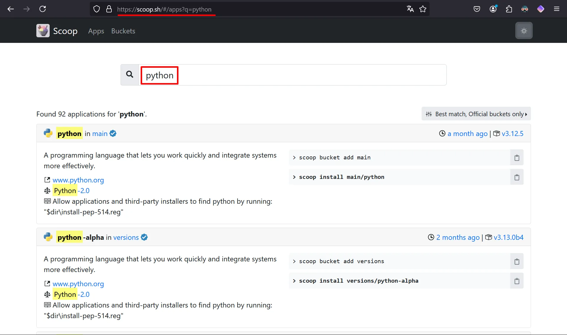 A la pàgina web de Scoop.sh pots buscar paquets, per exemple {% link “/python/” %}: